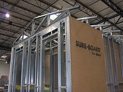 ![]() The eave detail was wrong; they're clipping it back to the correct dimension. The sheathing shown is a metal sheet; everything structural about the house is galvanized steel. All of the sheetrock on the interior is 5/8", not 1/2". The bath is all green board (moisture resistant). |